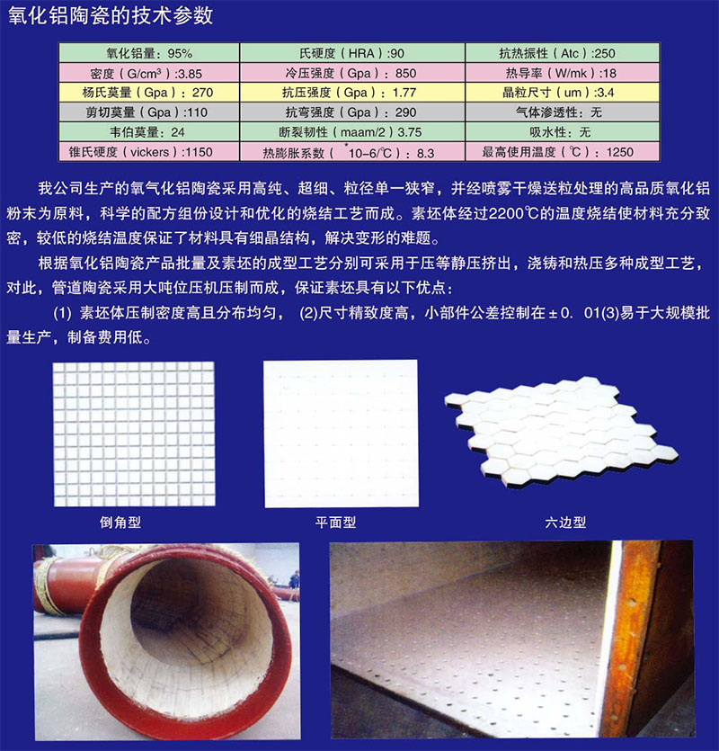 氧化铝耐磨陶瓷衬片的特点:产品具有密度大、磨耗低、抗冲击、表面光滑、施工方便等特点,是钢铁厂、电厂、矿山等行业的物料输送设备的表面耐磨材料,有效延长设备的使用周期;氧化铝衬片的使用范围:主要应用于煤炭、钢铁、矿山、火力发电厂等行业的设备耐磨内衬,特别适用于电厂输煤、输渣管道及矿山和码头的输料道、落料槽、螺旋管道、卸料口及粉尘设备等磨损较大处。